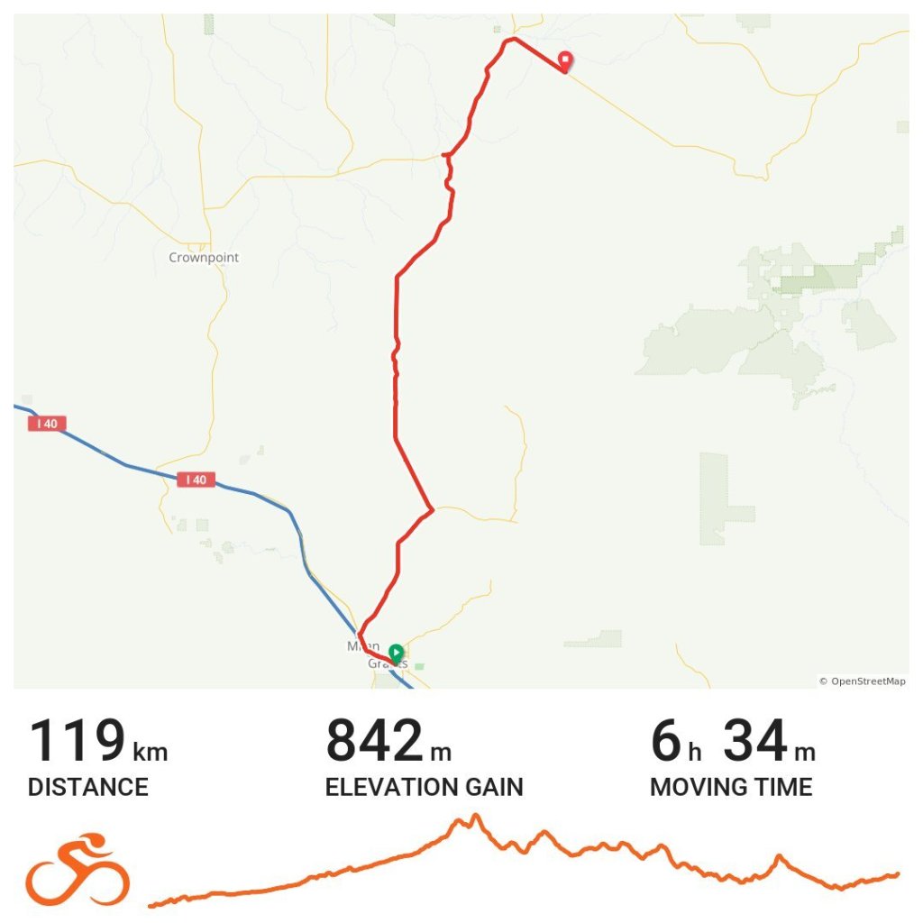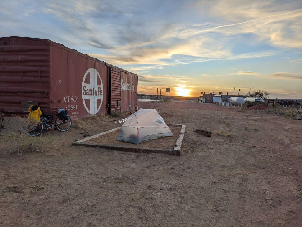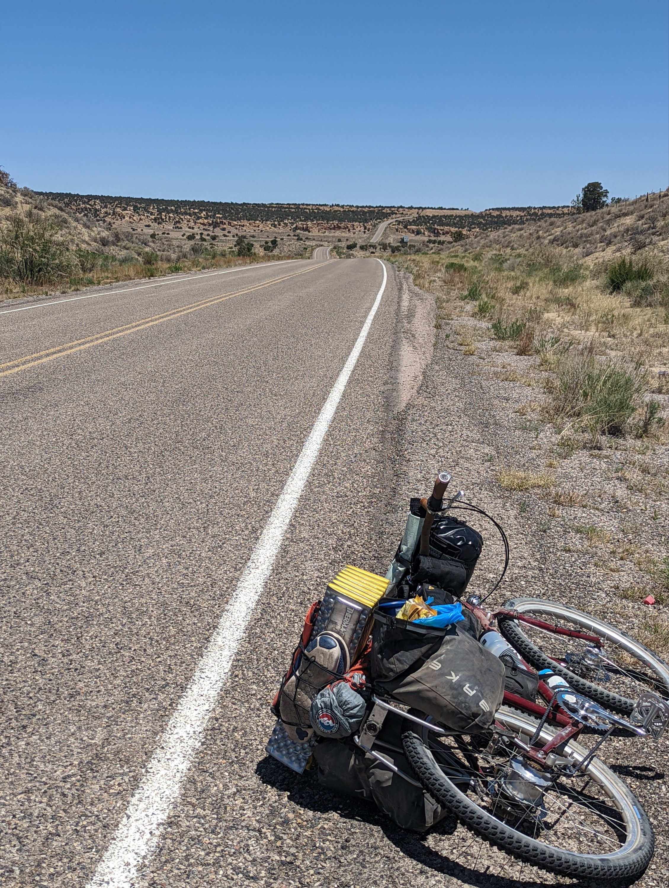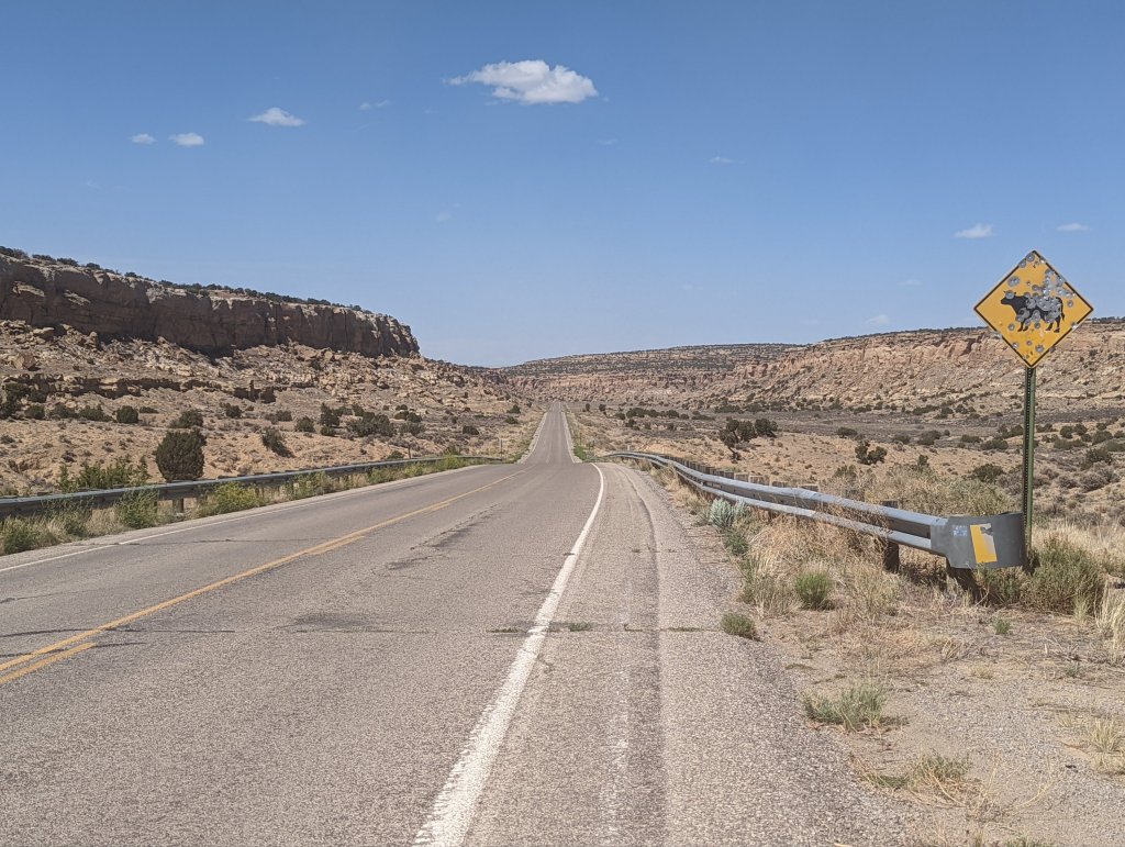 Anticipating some heavy climbing in the days ahead, I took a stunning alternative route on asphalt through the Chaco Mesa. Road signs are in km on Navajo Road. Stopped at the only store along the way to camp.