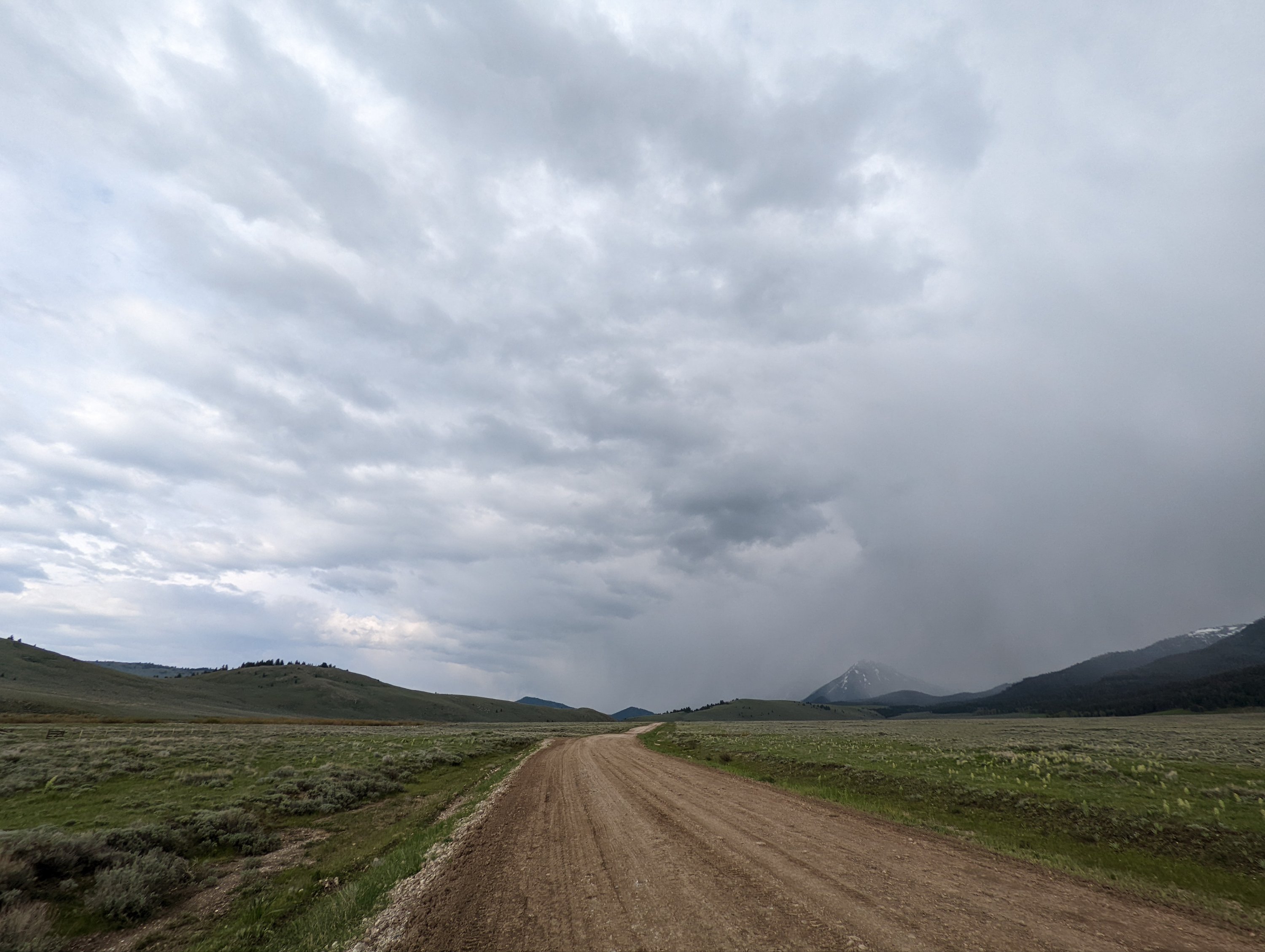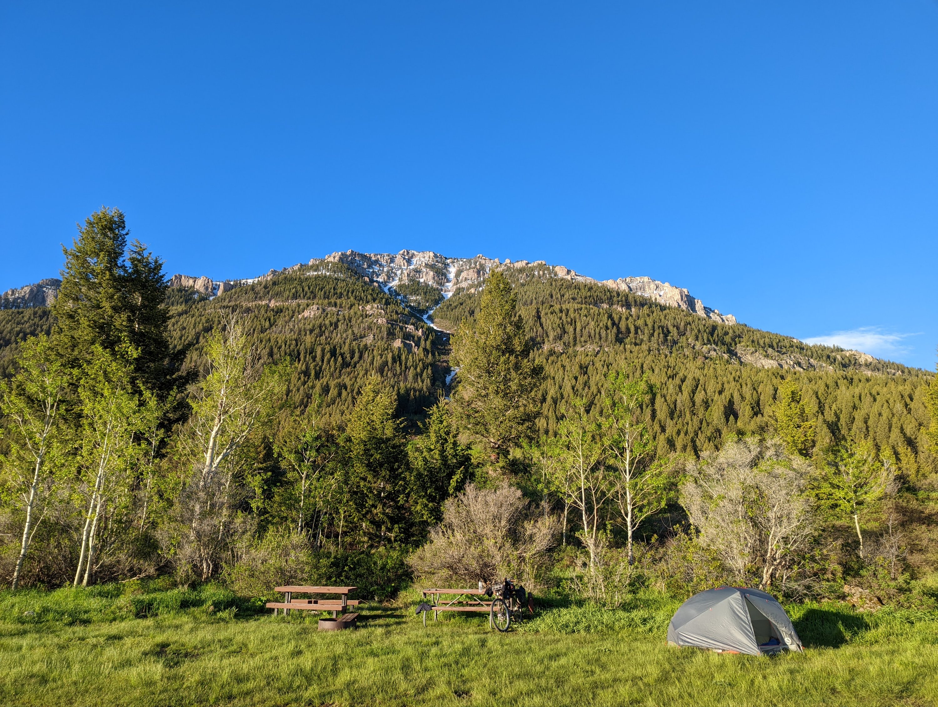 The weather was clear after crossing the pass. A beautiful but chilly ride. Settled in for the night on the shore of a lake with a stunning mountain background.