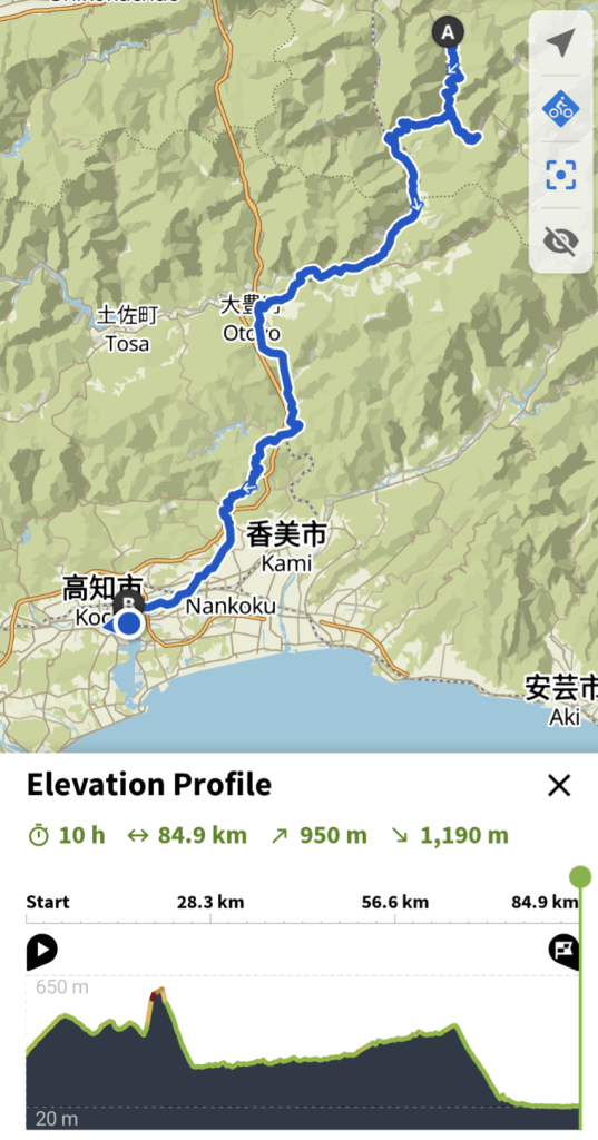 After leaving camp we headed to a popular vine bridge destination over the Iya River with incredible views of the valley at every turn. We dealt with some broken spokes and then made our way to Kochi along the Yoshino River followed by the Ananai River watching kayakers run rapids as we climbed beside them in the opposing direction to the pass. From there Kochi was a 20 km downhill run. A palm tree boulevard welcomed us into the city as the sun set.