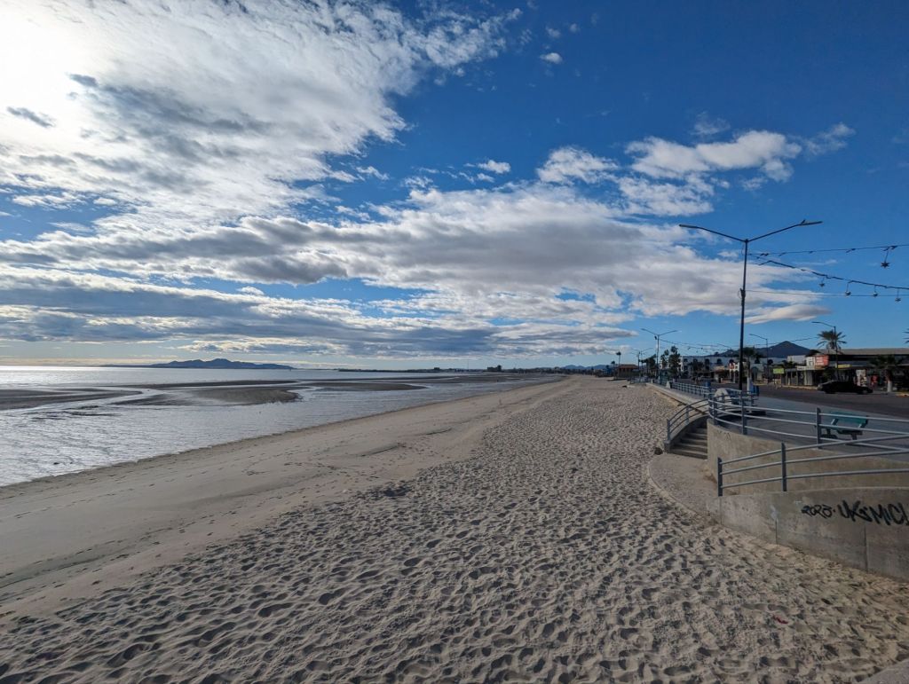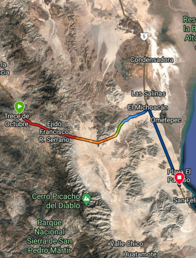 Beautiful descent from the cold mountain air in Lazaro Cardenas through sage and cacti lands to the Golfo de California and the busy town of San Felipe. Off season now, the coastline is dotted with holiday communities and resorts, catering to off-road motorbikes or quads and retired folk. With tailwinds I will now head south along this coast.