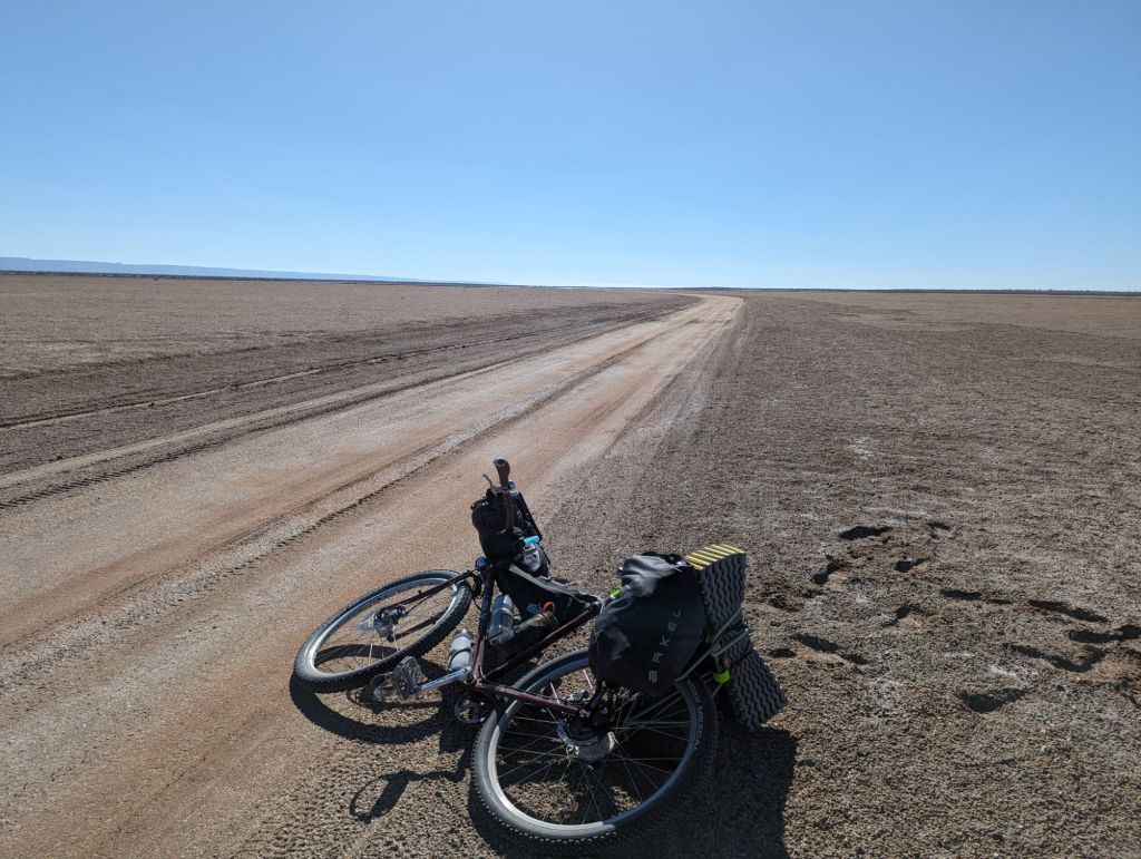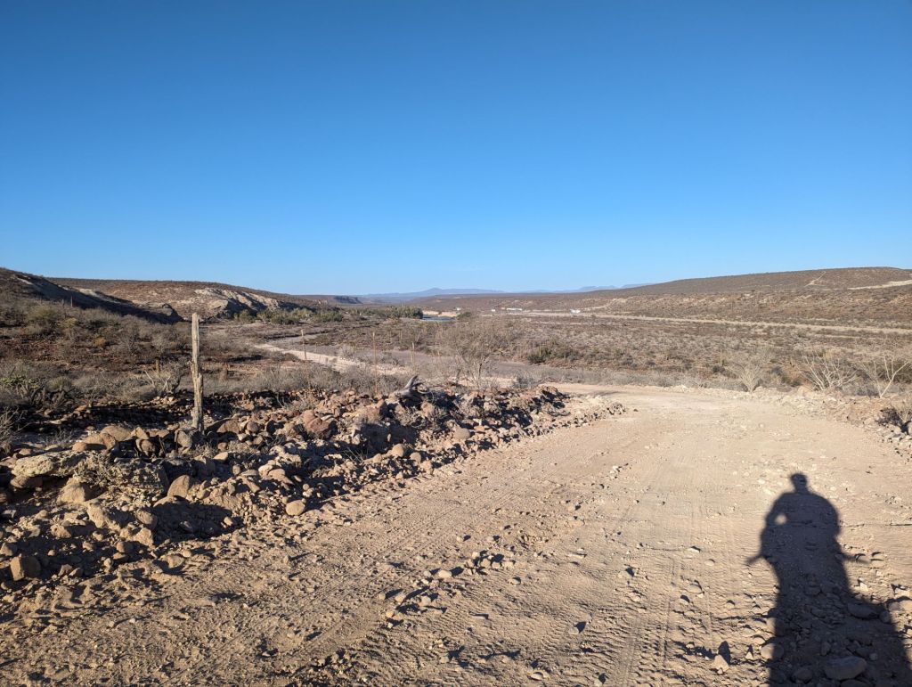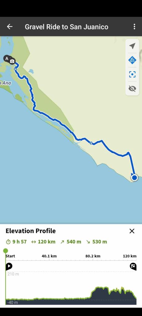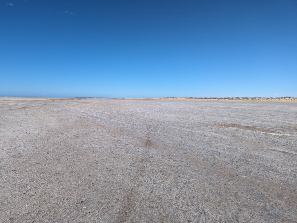 After a hearty breakfast of Mexican eggs and a bike loaded with 6l of water I was off on a direct route on the salt flats instead of on the sandy and rocky shore road. Losing my way a few times had me deep in sand or deep in salty wet mud. I readjusted, walking my way out of trouble, and more or less followed the planned route – a route that changes with extreme high tides due to storm surges. The way took me through a number of settlements but no one seemed there. There were no open signed stores when I passed through. As the sun started to set I contemplated sleeping out but was keen on getting a good meal. I rolled into San Juanico at sunset and made it to a beach bar for ceviche and a Pacifico before checking into a cheap hotel room for the night.